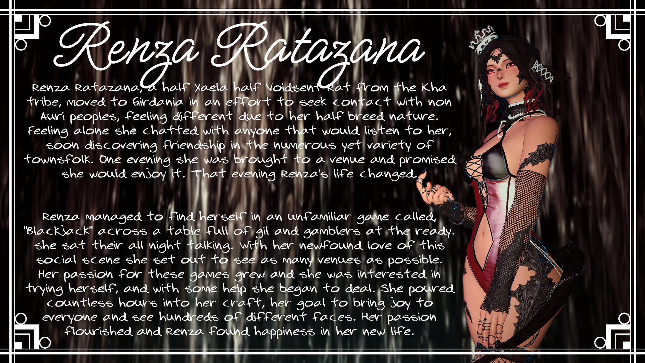 Hi! My name is Renza, and I'll be your dealer tonight! Here you can learn all about me! Check out my various tabs, and most importantly have fun!